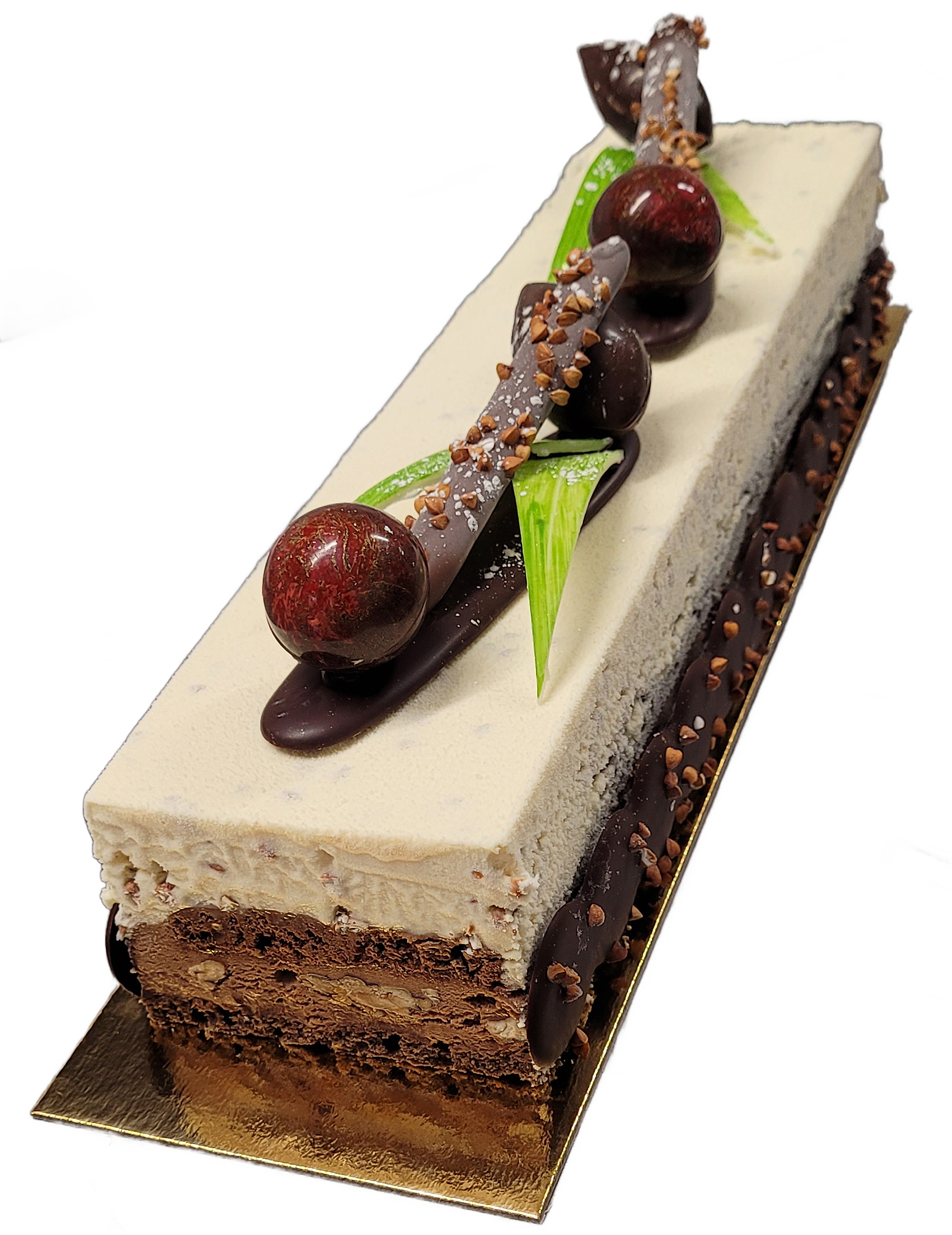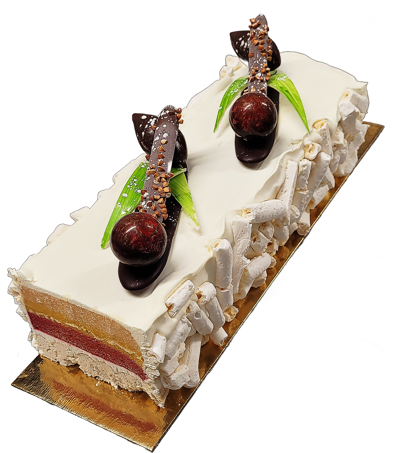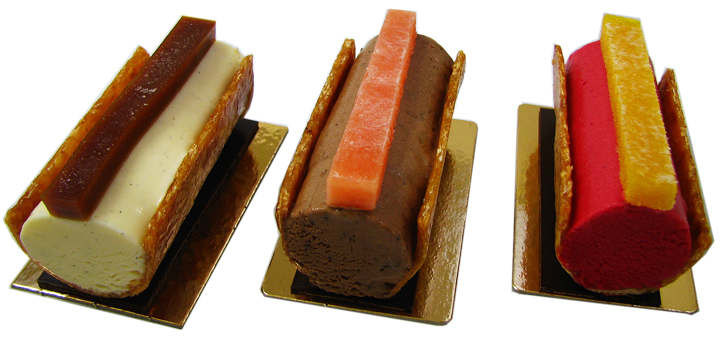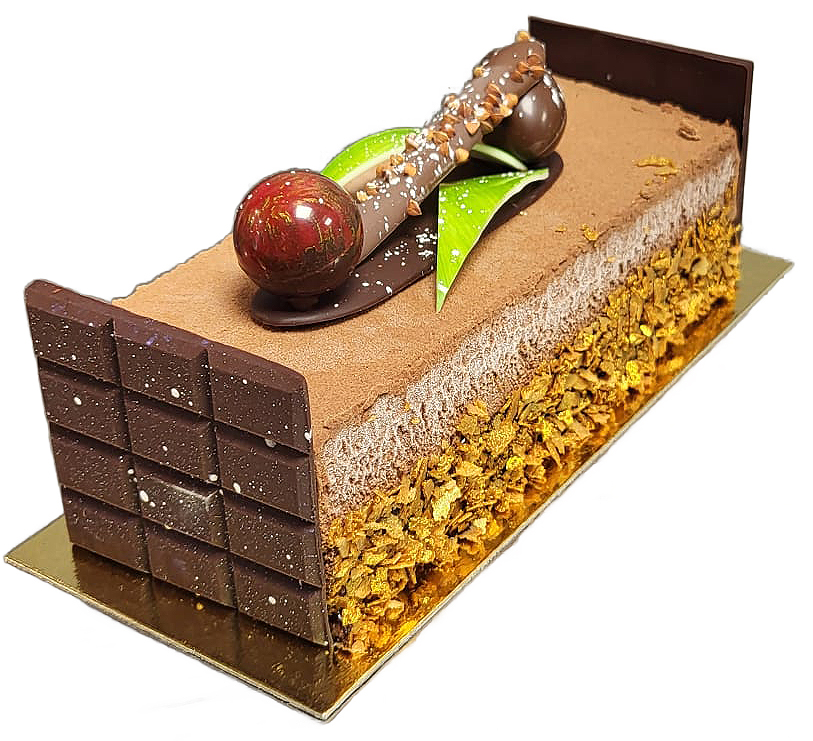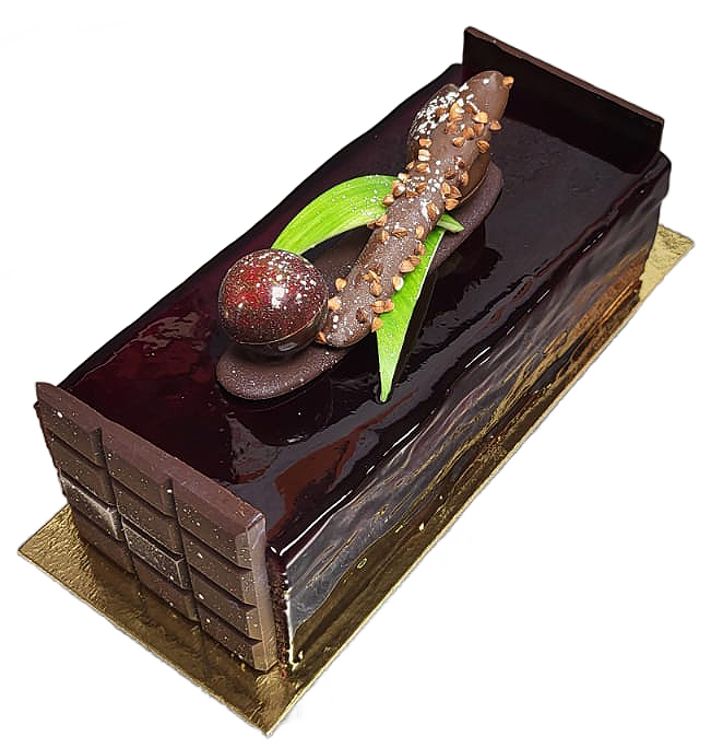 Sur une base de génoise au chocolat, nous disposons une crème brûlée à la vanille "Bourbon" de Madagascar, une mousse de chocolat noir grand cru et une pulpe cerise-framboise. |