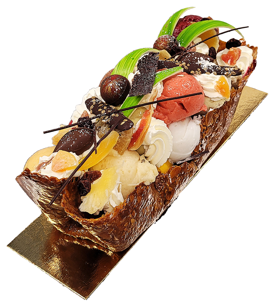 Pétale en nougatine, assortiment de nos glaces et sorbets, fruits séchés, chocolat et chantilly "maison". |